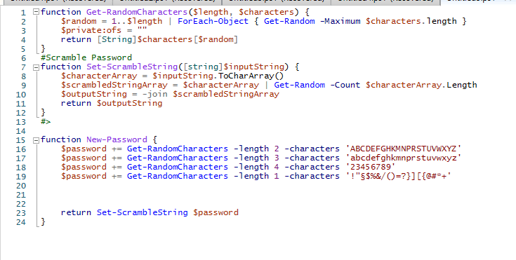 New-Password uses function Get-RandomCharacters to generate a random password based on rules defined.
